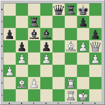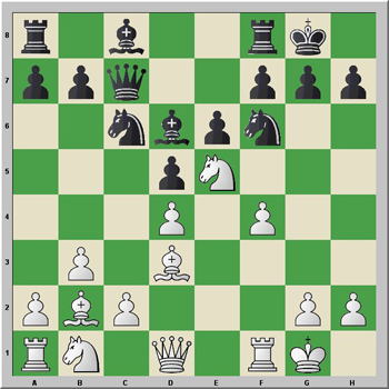 1.d4 Cf6 2.Cf3 e6 3.e3 c5 4.Ad3 d5 5.b3 Cc6 6.O-O Ad6 7.Ab2 O-O 8.Ce5 Dc7 9.f4 cxd4 10.exd4 Cb4 11.Cc3 Cxd3 12.Dxd3 Ad7 13.Tf3 Tfc8